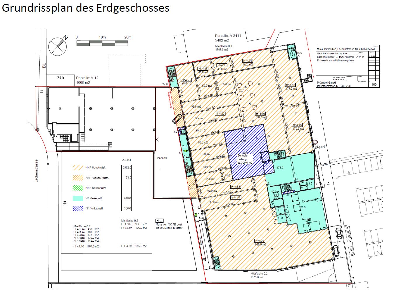 Der fast rechteckige Gebäudegrundriss bietet rund 900 m2 vermietbare Fläche im EG, sowie rund 250 m2 Büroflächen im OG zur Strasse. In den überhohen Räumlichkeiten könnte ein Zwischenboden eingezogen werden.
